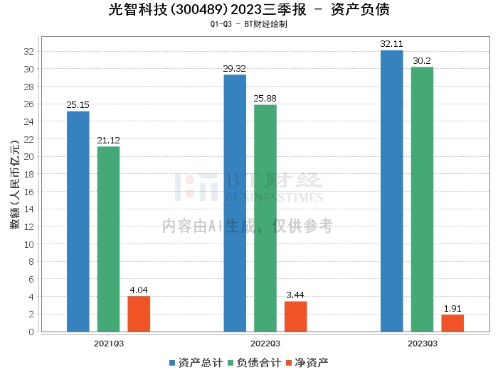 从资产负债方面来看,光智科技2023年三季报显示,公司总资产为32.11亿元,相比上年度末的29.4亿元增长了9.20%。负债合计为30.2亿元,相比上年度末的26.42亿元增长了14.29%。净资产为1.91亿元,相比上年度末的2.99亿元下降了36.00%。资产负债率为94.05%,相比上年度末的89.85%有所上升,这可能是由于公司偿还到期的短期借款。