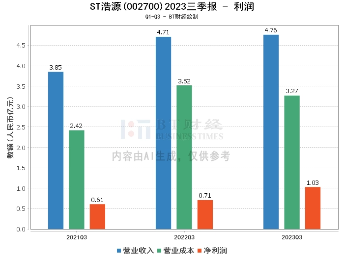 在利润方面,ST浩源2023年三季度的营业收入为4.76亿元,与上年同期的4.71亿元相比增长了0.97%。营业利润为1.24亿元,相比上年同期的8053.33万元有所增长。营业成本为3.27亿元,相比上年同期的3.52亿元有所下降。净利润为1.03亿元,相比上年同期的7070.44万元增长了40.98%。这些数据显示,公司的盈利能力在提高。