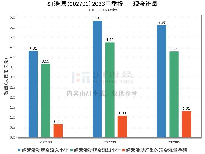在现金流量方面,ST浩源2023年三季度经营活动产生的现金流量净额为1.31亿元,相比上年同期的1.08亿元增长了21.61%。经营活动现金流入小计为5.59亿元,相比上年同期的5.81亿元有所下降。经营活动现金流出小计为4.28亿元,相比上年同期的4.73亿元有所下降。这些数据显示,公司的现金流状况良好。
