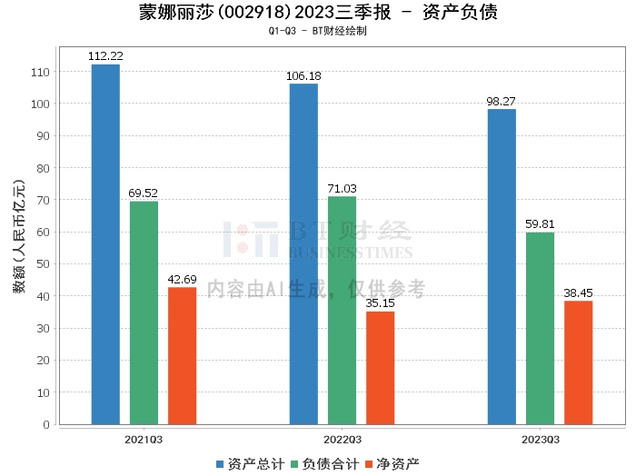 在资产负债方面,蒙娜丽莎2023年三季度的总资产为98.27亿元,相比上年度末的101.8亿元有所下降。负债合计为59.81亿元,较上年度末的66.37亿元减少,资产负债率由上年度末的65.2%下降到本报告期末的60.87%,显示出公司负债管理的效果。净资产为38.45亿元,相比上年度末的35.42亿元有所增长。