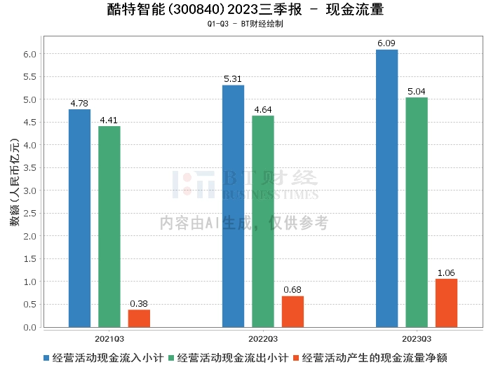从现金流量方面来看,2023年三季度,酷特智能的经营活动产生的现金流量净额为1.06亿元,同比增长56.73%。经营活动现金流入小计为6.09亿元,同比增长14.68%。经营活动现金流出小计为5.04亿元,同比增长8.62%。这些数据表明,公司的现金流量状况良好,经营活动的现金流量净额增长主要是由于收入增长及加强货款回收所致。