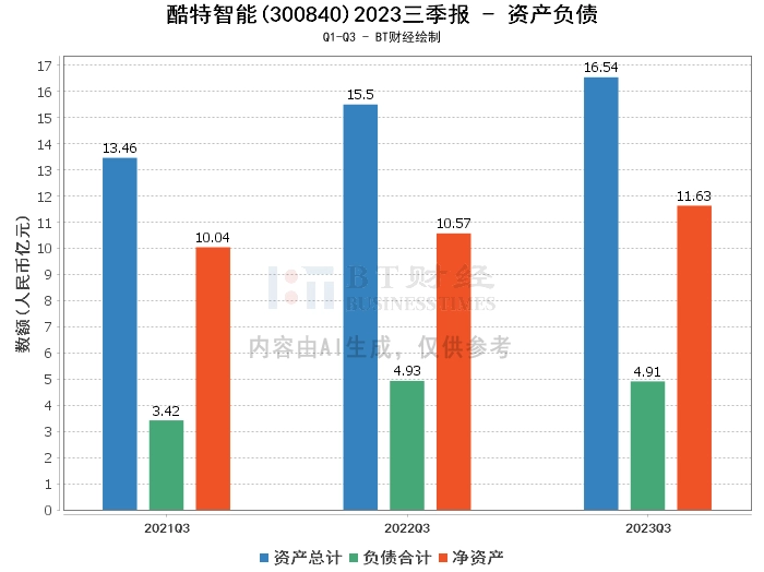 从资产负债方面来看,2023年三季度末,酷特智能的总资产为16.54亿元,相比上年度末的15.83亿元增长了4.49%。负债合计为4.91亿元,较上年度末的5.02亿元有所下降。净资产为11.63亿元,相比上年度末的10.81亿元增长了7.86%。资产负债率为29.68%,较上年度末的31.72%有所下降,表明公司的资产负债结构进一步优化。