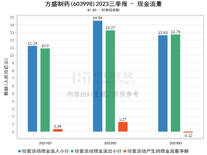 在现金流量方面,方盛制药2023年三季度的经营活动产生的现金流量净额为-1151.21万元,相比上年同期的1.27亿元大幅下降。经营活动现金流入小计为12.63亿元,相比上年同期的14.54亿元下降了13.15%。经营活动现金流出小计为12.74亿元,相比上年同期的13.27亿元下降了3.99%。这些数据表明,公司的现金流量状况较为紧张。