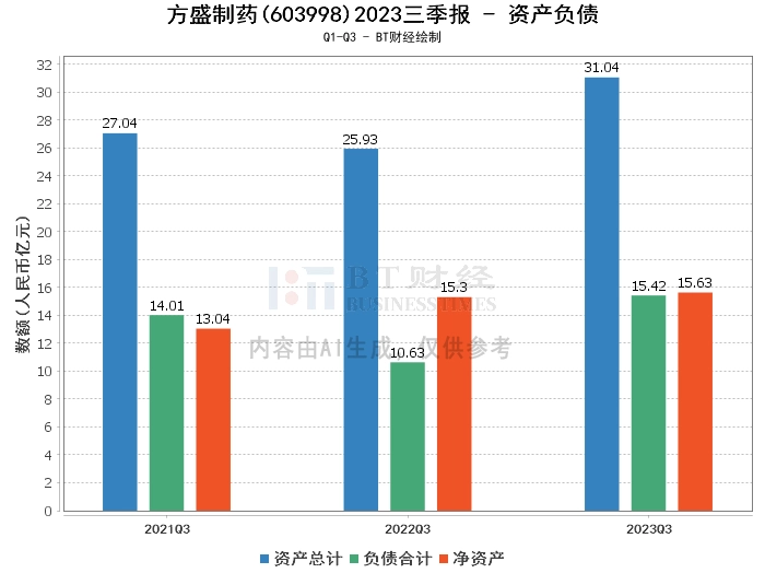 在资产负债方面,方盛制药2023年三季度末的总资产为31.04亿元,相比上年度末的29.22亿元增长了6.24%。负债合计为15.42亿元,相比上年度末的14.14亿元增长了9.04%。公司的资产负债率为49.66%,较上年度末的48.4%有所上升。净资产为15.63亿元,相比上年度末的15.08亿元增长了3.64%。这些数据表明,公司的资产规模在扩大,但负债也在增加,资产负债率有所上升,表明公司的财务风险有所增加。