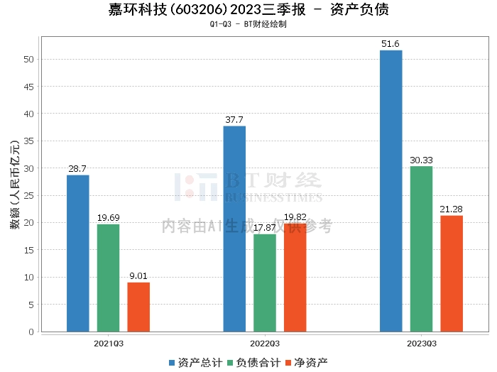 在资产负债方面,嘉环科技2023年三季度的总资产为51.6亿元,相比上年度末的45.21亿元增长14.13%。负债合计为30.33亿元,相比上年度末的24.37亿元增长24.45%,资产负债率从上年度末的53.9%上升到本报告期末的58.77%。净资产为21.28亿元,相比上年度末的20.84亿元微增2.06%。商誉保持稳定,为14.79万元。
