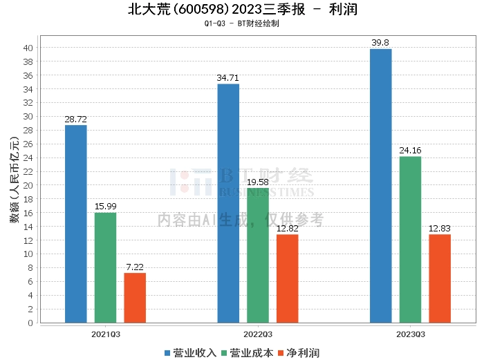 在利润方面,北大荒2023年三季度的营业收入为39.8亿元,相比上年同期的34.71亿元增长了14.68%。营业利润为13.11亿元,相比上年同期的12.79亿元有所增长。营业成本为24.16亿元,相比上年同期的19.58亿元增长了23.35%。净利润为12.83亿元,与上年同期的12.82亿元基本持平。
