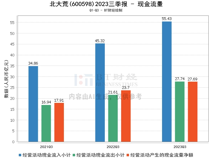 从现金流量来看,北大荒2023年三季度的经营活动产生的现金流量净额为27.69亿元,相比上年同期的23.7亿元增长了16.82%。经营活动现金流入小计为55.43亿元,相比上年同期的45.32亿元增长了22.32%。经营活动现金流出小计为27.74亿元,相比上年同期的21.61亿元增长了28.38%。