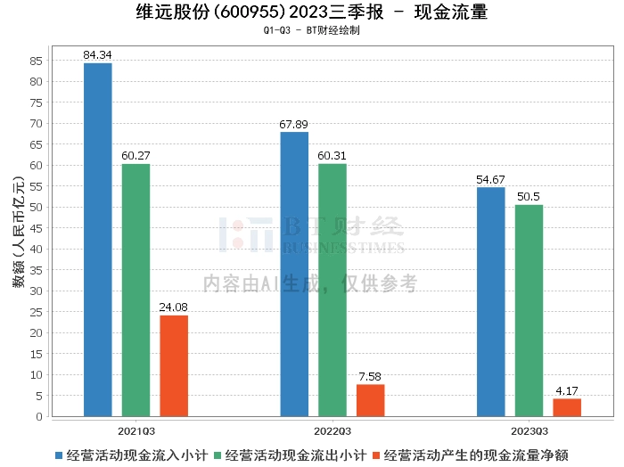在现金流量方面,维远股份2023年三季度的经营活动产生的现金流量净额为4.17亿元,较上年同期的7.58亿元下降44.97%。经营活动现金流入小计为54.67亿元,较上年同期的67.89亿元有所下降。经营活动现金流出小计为50.5亿元,较上年同期的60.31亿元有所下降。