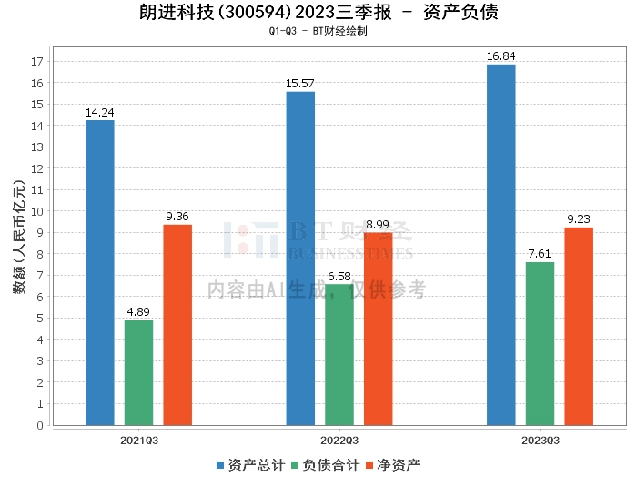 从资产负债方面来看,朗进科技2023年三季度末的总资产为16.84亿元,相比上年度末的17.37亿元有所下降。负债合计为7.61亿元,较上年度末的8.37亿元有所减少。净资产为9.23亿元,较上年度末的8.99亿元有所增加。资产负债率为45.21%,较上年度末的48.21%有所下降。这些变化主要系本期支付的票据增加,持有的尚未使用的银行承兑汇票、云信减少,以及募投项目验收完毕,在建工程转资所致。