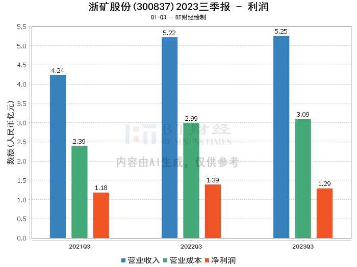 在利润方面,浙矿股份2023年三季度的营业收入为5.25亿元,与上年同期的5.22亿元相比微增0.57%。营业利润为1.55亿元,相比上年同期的1.66亿元有所下降。营业成本为3.09亿元,相比上年同期的2.99亿元增长了3.34%。净利润为1.29亿元,相比上年同期的1.39亿元下降了7.14%。毛利率为41.17%,相比上年同期的42.7%有所下降。净利率为24.52%,相比上年同期的26.61%也有所下降。这表明公司的盈利能力有所下降。