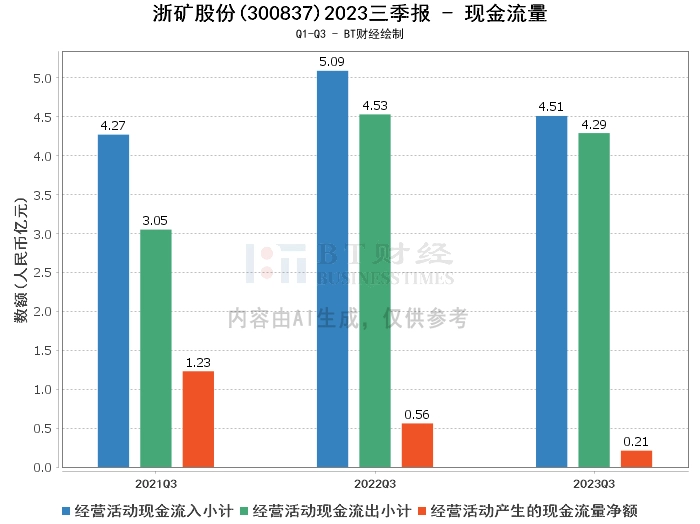 在现金流量方面,浙矿股份2023年三季度经营活动产生的现金流量净额为2148万元,相比上年同期的5622.36万元下降了61.80%。经营活动现金流入小计为4.51亿元,相比上年同期的5.09亿元有所下降。经营活动现金流出小计为4.29亿元,相比上年同期的4.53亿元有所下降。这表明公司的经营活动产生的现金流量有所下降,公司的现金流动性有所减弱。