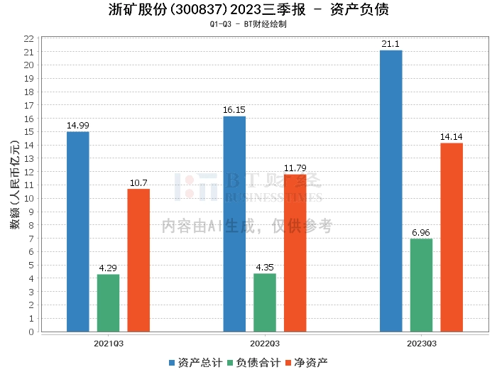 从资产负债方面看,浙矿股份2023年三季度的总资产为21.1亿元,相比上年度末的15.99亿元增长了31.95%。负债合计为6.96亿元,相比上年度末的3.72亿元增长了87.37%。净资产为14.14亿元,相比上年度末的12.27亿元增长了15.23%。资产负债率为32.99%,相比上年度末的23.29%有所上升。这表明公司的资产规模在扩大,但负债也在增加,财务风险有所提高。