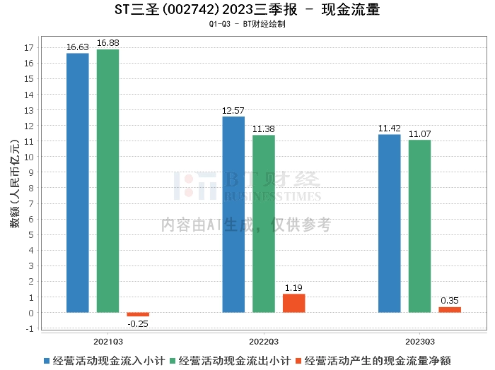 在现金流量方面,ST三圣2023年三季度经营活动产生的现金流量净额为3498.25万元,较上年同期的1.19亿元大幅下滑70.69%。经营活动现金流入小计为11.42亿元,较上年同期的12.57亿元有所减少。经营活动现金流出小计为11.07亿元,较上年同期的11.38亿元略有下降。