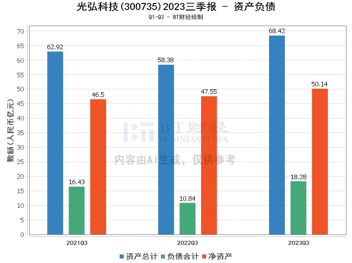 从资产负债方面来看,光弘科技2023年三季度的总资产为68.42亿元,相比上年度末的58.18亿元增长了17.50%。负债合计为18.28亿元,相比上年度末的9.72亿元增长了88.02%,资产负债率从上年度末的16.71%上升到了本报告期末的26.72%,这主要是由于新增的银行借款和备货增加导致应付账款增加。净资产为50.14亿元,相比上年度末的48.45亿元增长了3.49%。