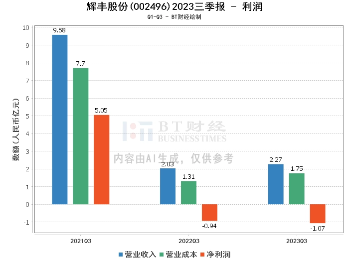 在利润方面,辉丰股份2023年三季度的营业收入为2.27亿元,较上年同期的2.03亿元增长了11.67%。营业成本为1.75亿元,较上年同期的1.31亿元有所增加。毛利率为22.64%,较上年同期的35.44%有所下降。归属于上市公司股东的净利润为-1.02亿元,较上年同期的-53.90%有所下降。