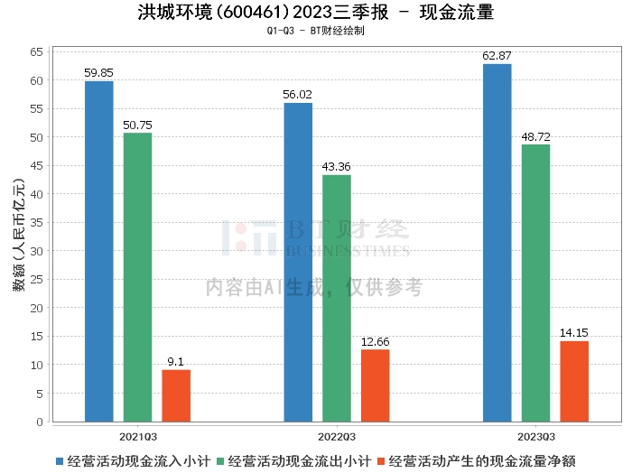 在现金流量方面,洪城环境2023年三季度的经营活动产生的现金流量净额为14.15亿元,相比上年同期的12.56亿元有所增长。经营活动现金流入小计为62.87亿元,相比上年同期的56.21亿元有所增长。经营活动现金流出小计为48.72亿元,相比上年同期的43.65亿元有所增长。这些数据显示,公司的现金流量状况良好,经营活动产生的现金流量净额保持增长。