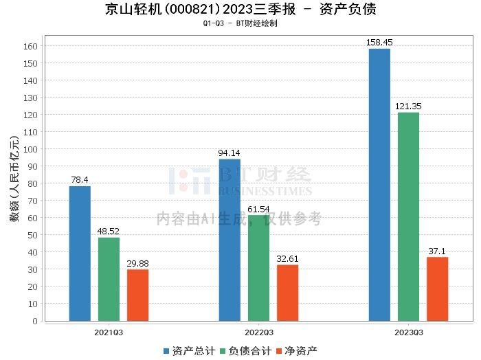从资产负债方面来看,京山轻机在2023年三季度的总资产为158.45亿元,相比上年度末的99.64亿元有显著增长。负债合计在本报告期末为121.35亿元,相比上年度末的66.02亿元也有所增加。净资产在本报告期末为37.1亿元,相比上年度末的33.62亿元略有增长。资产负债率在本报告期末为76.58%,相比上年度末的66.26%有所上升。