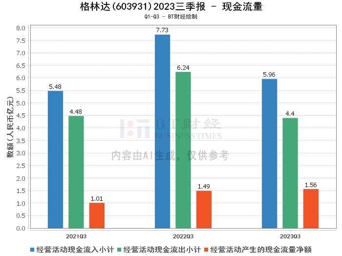 在现金流量方面,格林达2023年三季度经营活动产生的现金流量净额为1.56亿元,相比上年同期的1.49亿元有所增长。经营活动现金流入小计为5.96亿元,相比上年同期的7.73亿元有所减少。经营活动现金流出小计为4.4亿元,相比上年同期的6.24亿元有所减少。这表明公司的现金流动状况良好,现金流量的增长对公司的经营有积极影响。