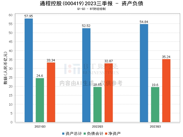 从资产负债方面来看,通程控股2023年三季度的资产总计为54.84亿元,相比上年度末的52.31亿元增长了4.84%。负债合计为19.6亿元,相比上年度末的18.81亿元增长了4.2%。净资产为35.24亿元,相比上年度末的33.51亿元增长了5.15%。资产负债率为35.74%,相比上年度末的35.95%有所下降。这表明公司的总资产和净资产都在稳步增长,而负债增长的速度相对较慢,整体的负债率有所下降,显示出公司的财务状况较为稳健。