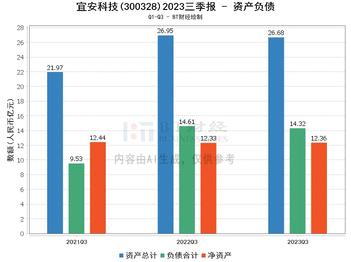 从资产负债方面来看,2023年三季度末,宜安科技的总资产为26.68亿元,相比上年度末的27.95亿元有所下降。负债合计为14.32亿元,相比上年度末的15.57亿元也有所减少。净资产为12.36亿元,与上年度末的12.38亿元相比基本持平。资产负债率为53.68%,较上年度末的55.7%有所下降。这些变动主要与公司的货币资金减少、应收款项融资增长、预付账款增长、在建工程下降、使用权资产增长、无形资产增长、开发支出增长、应付票据下降、合同负债增长、应交税费下降、其他应付款下降和租赁负债增长等因素有关。