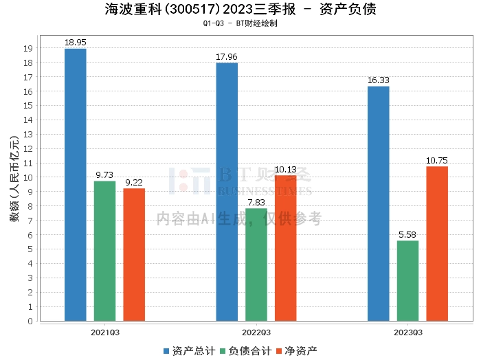 从资产负债方面来看,海波重科2023年三季度末的总资产为16.33亿元,相比上年度末的17.5亿元有所下降。负债总额为5.58亿元,相较上年度末的7.2亿元也有所减少。这主要是因为公司在报告期内购买了理财产品,同时在建工程投入增加,新增了银行贷款,以及支付了上年应付的职工薪酬等因素。公司的净资产为10.75亿元,相比上年度末的10.31亿元有所增加。资产负债率为34.19%,较上年度末的41.11%有所下降,显示出公司的负债状况有所改善。