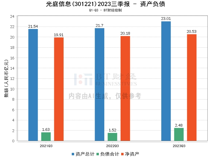 从资产负债方面看,2023年三季度末,光庭信息的总资产为23.01亿元,相比上年度末的22.16亿元增长了3.84%。负债合计为2.48亿元,相比上年度末的1.7亿元增长了45.88%,资产负债率为10.76%,较上年度末的7.67%有所上升。公司的净资产为20.53亿元,较上年度末的20.46亿元略有增长。