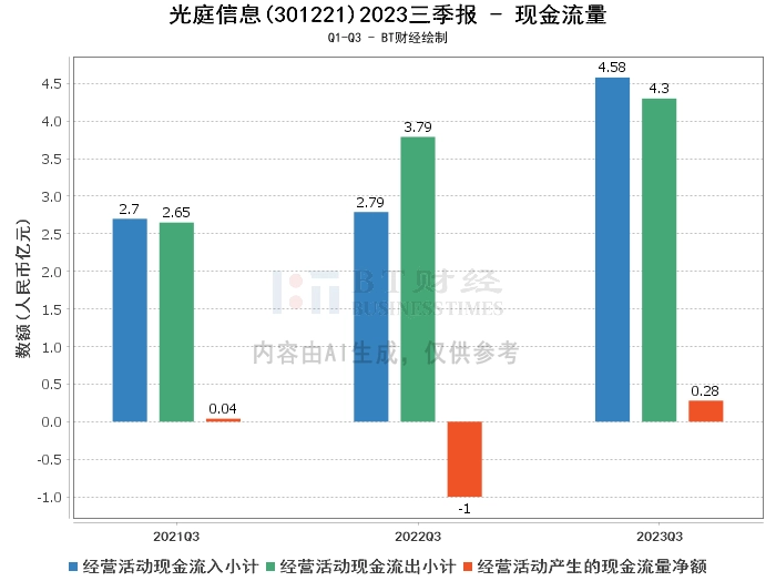 在现金流量方面,2023年1-9月期间,公司经营活动产生的现金流量净额为2781.15万元,同比增长127.87%,经营活动现金流入小计为4.58亿元,同比增长64.16%,经营活动现金流出小计为4.3亿元,同比增长13.45%。
