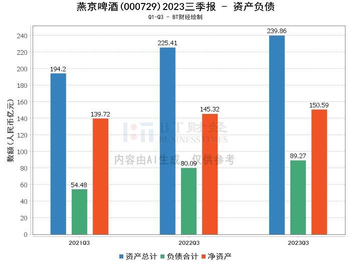 根据公司2023年三季报,燕京啤酒的总资产为239.86亿元,相比上年度末的206.95亿元有所增长。负债合计为89.27亿元,相比上年度末的64.29亿元有所增加。净资产为150.59亿元,相比上年度末的142.66亿元有所增长。资产负债率为37.22%,相比上年度末的31.06%有所上升。这些数据反映出公司的资产规模在扩大,同时负债也有所增加,但公司的净资产仍在增长,整体财务状况稳定。
