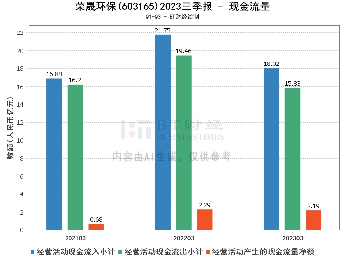 在现金流量方面,荣晟环保2023年三季度的经营活动产生的现金流量净额为2.19亿元,较上年同期的2.29亿元略有下滑。经营活动现金流入小计为18.02亿元,较上年同期的21.75亿元有所减少。经营活动现金流出小计为15.83亿元,较上年同期的19.46亿元有所减少。