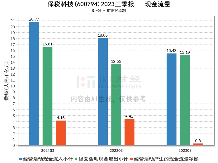 在现金流量方面,保税科技2023年三季度的经营活动产生的现金流量净额为2976.73万元,相比上年同期的4.41亿元有所下降。经营活动现金流入小计为15.48亿元,相比上年同期的18.06亿元有所下降。经营活动现金流出小计为15.19亿元,相比上年同期的13.66亿元有所增长。这表明公司的现金流量状况存在一定的压力。