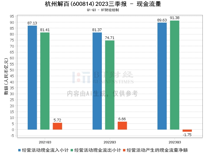 在现金流量方面,年初至本报告期末,杭州解百的经营活动产生的现金流量净额为-1.75亿元,较上年同期的6.66亿元下降126.20%,主要系购买银行定期存款类产品导致现金流出所致。经营活动现金流入小计为89.63亿元,较上年同期的81.37亿元增长10.16%。经营活动现金流出小计为91.38亿元,较上年同期的74.71亿元增长22.31%。这表明公司的现金流出较多,现金流量净额下降明显,需要关注其现金流动情况。