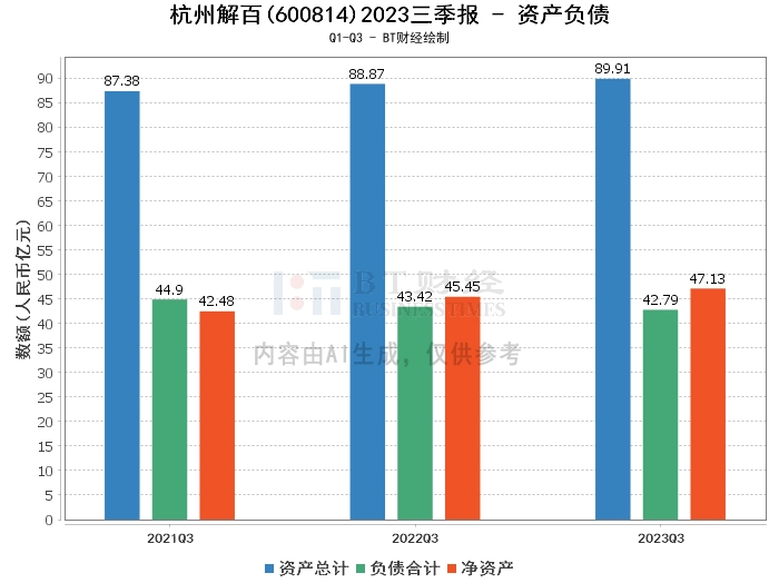 在资产负债方面,2023年三季度末,杭州解百的总资产为89.91亿元,较上年度末的85.83亿元增长4.76%。负债合计为42.79亿元,较上年度末的42.45亿元略有增长。净资产为47.13亿元,较上年度末的43.38亿元增长8.67%。资产负债率为47.59%,较上年度末的49.46%有所下降。这表明公司的资产规模在持续扩大,负债规模基本稳定,净资产增长较快,公司的整体财务状况良好。