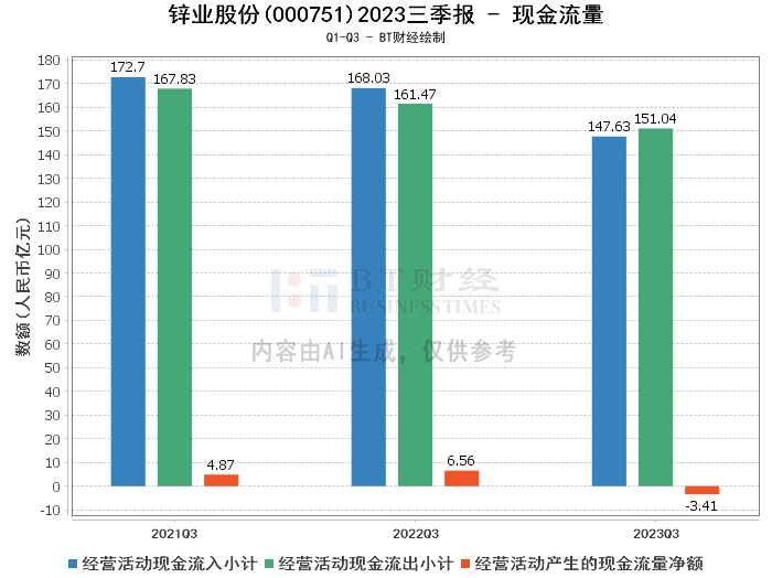 在现金流量方面,公司2023年三季度的经营活动产生的现金流量净额为-3.41亿元,较上年同期的6.56亿元大幅下降。经营活动现金流入小计为147.63亿元,较上年同期的168.03亿元下降12.14%。经营活动现金流出小计为151.04亿元,较上年同期的161.47亿元下降6.47%。这表明公司的经营活动现金流量净额出现了负值,可能是由于公司的经营活动现金流入减少所致。