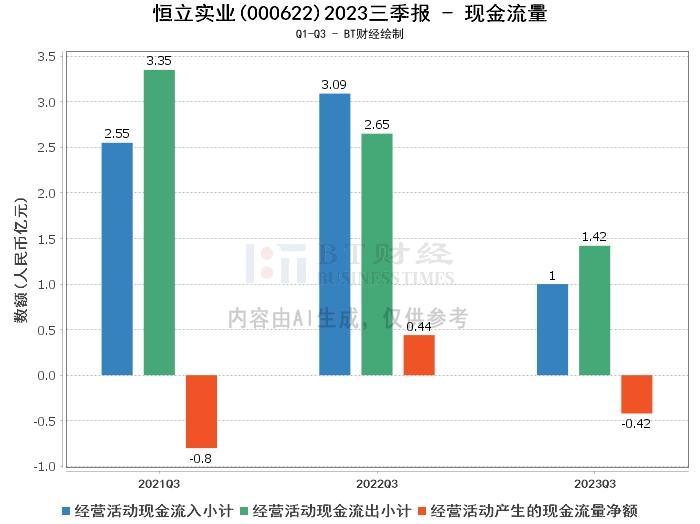 现金流量方面,恒立实业2023年三季度经营活动产生的现金流量净额为-4188万元,相比上年同期的4366.32万元大幅下降。经营活动现金流入小计为9984.5万元,相比上年同期的3.09亿元有所减少。经营活动现金流出小计为1.42亿元,相比上年同期的2.65亿元有所减少。