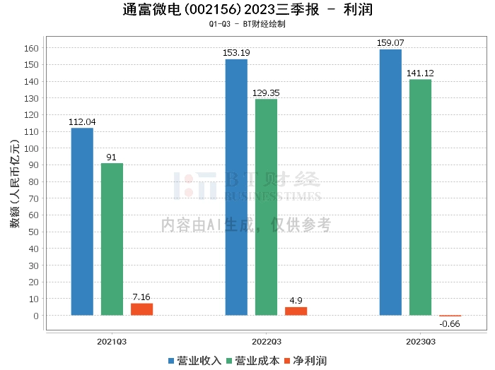 在利润方面,通富微电2023年三季度的营业收入为159.07亿元,相比上年同期的153.19亿元有所增长。然而,营业利润为-1.42亿元,相比上年同期的4.03亿元,公司在营业利润方面出现了亏损。净利润为-6614.97万元,相比上年同期的4.9亿元,公司的净利润也出现了亏损。这可能是由于公司的营业成本增加,年初至本报告期末的营业成本为141.12亿元,相比上年同期的129.35亿元有所增长。