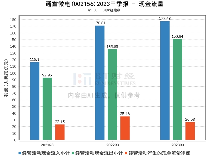 从现金流量来看,通富微电2023年三季度的经营活动产生的现金流量净额为26.58亿元,相比上年同期的35.16亿元有所减少。这可能是由于公司的经营活动现金流出增加,年初至本报告期末的经营活动现金流出小计为150.84亿元,相比上年同期的135.65亿元有所增长。
