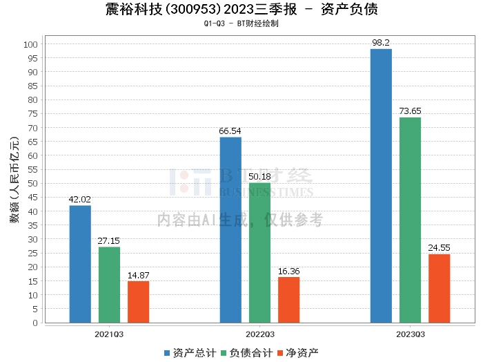 首先,从资产负债方面来看,震裕科技的总资产在本报告期末达到了98.2亿元,相比上年度末的78.07亿元增长了25.79%,这主要得益于公司在第三季度的收入同比增长25.43%,相应的应收款项增加。同时,公司的负债合计也从上年度末的54.17亿元增长到了本报告期末的73.65亿元,增长幅度为36.02%,主要是由于公司规模增加,厂房设备投资增加,从银行取得借款增加所致。净资产则从上年度末的23.9亿元微增至本报告期末的24.55亿元。资产负债率从上年度末的69.38%上升到本报告期末的75%,这可能是由于公司的负债增长速度超过了资产的增长速度。