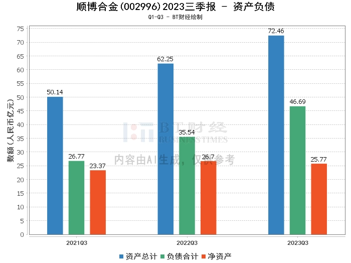 从资产负债方面看,顺博合金2023年三季度的总资产为72.46亿元,相比上年度末的58.99亿元增长了22.83%。负债合计46.69亿元,相比上年度末的32.89亿元增长了41.91%。净资产25.77亿元,相比上年度末的26.1亿元略有下降。资产负债率为64.44%,相比上年度末的55.75%有所上升。