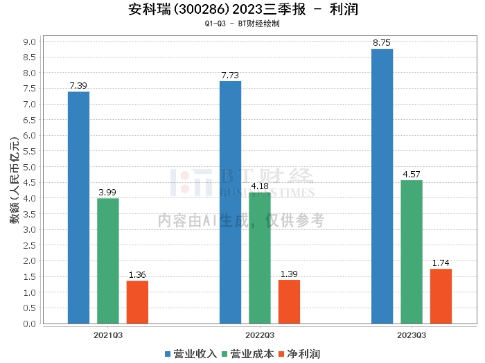 在利润方面,安科瑞公司2023年三季度的营业收入为8.75亿元,较上年同期的7.73亿元增长13.26%。营业利润为1.95亿元,较上年同期的1.58亿元增长,显示出公司盈利能力的提升。净利润为1.74亿元,较上年同期的1.39亿元增长25.52%,净利润的增长表明公司的盈利能力进一步提升。