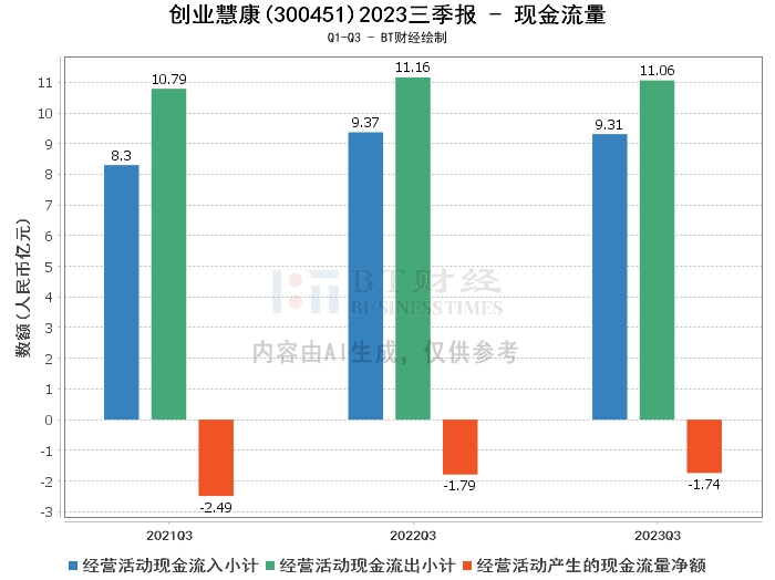 在现金流量方面,创业慧康2023年三季度经营活动产生的现金流入为9.31亿元,相比上年同期的9.37亿元略有下降。经营活动产生的现金流出为11.06亿元,相比上年同期的11.16亿元略有减少。这表明公司在经营活动方面的现金流量管理相对稳定。