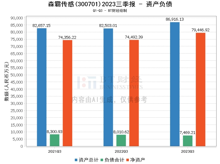 从资产负债方面来看,森霸传感2023年三季度的总资产为8.69亿元,相比上年度末的8.48亿元有所增长。负债合计为7469.21万元,较上年度末的9160.36万元有所减少。公司的净资产从上年度末的7.57亿元增长到本报告期末的7.94亿元。资产负债率从上年度末的10.8%下降到本报告期末的8.59%,显示出公司的财务结构正在优化。