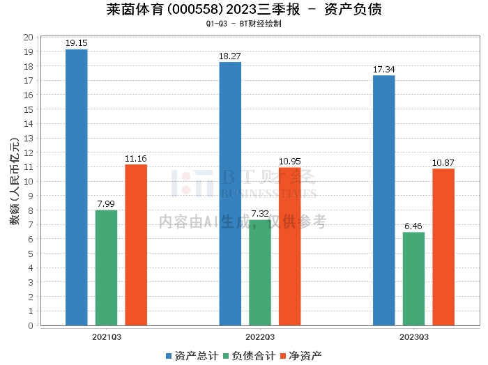 在资产负债方面,2023年三季度末,莱茵体育的总资产为17.34亿元,相比上年度末的18.33亿元有所下降。负债总额也从上年度末的7.56亿元降至本报告期末的6.46亿元。公司的净资产则从上年度末的10.77亿元略微增长至本报告期末的10.87亿元。资产负债率从上年度末的41.23%下降至本报告期末的37.27%,这表明公司的负债压力有所减轻。