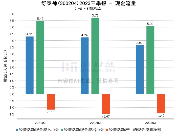 在现金流量方面,舒泰神2023年三季度经营活动产生的现金流量净额为-1.42亿元,较上年同期有所增长3.90%。经营活动现金流入小计为3.67亿元,较上年同期的4.24亿元有所下降。经营活动现金流出小计为5.09亿元,较上年同期的5.71亿元有所下降。