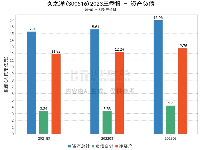 久之洋2023年三季度的财报数据显示,公司的资产总计为16.96亿元,比上年度末的15.1亿元有所增长,负债合计为4.2亿元,相比上年度末的2.57亿元有所上升,净资产为12.76亿元,较上年度末的12.53亿元略有增长。资产负债率为24.78%,较上年度末的17.05%有所上升。这些数据表明,公司的总资产和净资产均有所增长,但负债也有所增加,资产负债率有所上升,显示出公司在扩大经营规模的同时,负债也在增加。