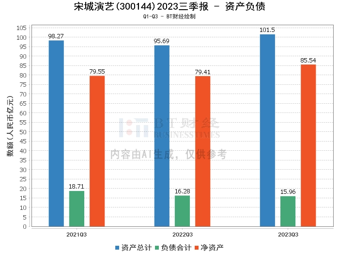 从资产负债方面看,宋城演艺2023年三季度末的总资产达到了101.5亿元,相比上年度末的94.2亿元增长了7.74%。负债合计为15.96亿元,相较于上年度末的15.88亿元略有增加。净资产为85.54亿元,较上年度末的78.33亿元增长了9.21%。资产负债率为15.73%,较上年度末的16.85%有所下降。这些数据显示,公司的资产规模在稳步增长,负债控制得当,整体财务状况良好。