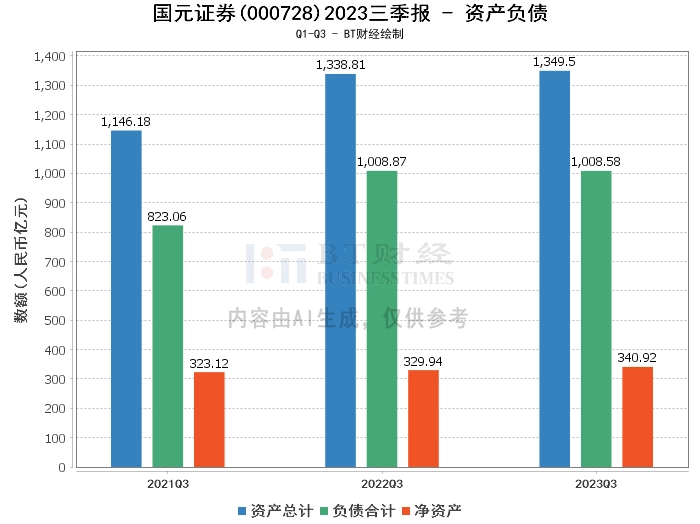 从资产负债方面来看,国元证券2023年三季度的总资产为1349.5亿元,相比上年度末的1295.04亿元有所增长。负债合计为1008.58亿元,较上年度末的965.5亿元略有上升。公司的净资产为340.92亿元,较上年度末的329.55亿元增长。资产负债率为74.74%,较上年度末的74.55%略有上升。这些数据显示,公司的资产负债状况稳健,净资产持续增长。
