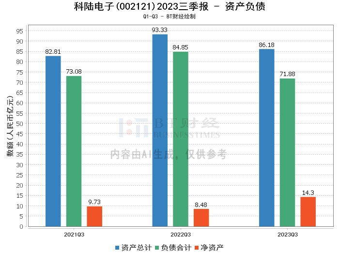 从资产负债方面来看,科陆电子2023年三季度的总资产为86.18亿元,相比上年度末的87.97亿元有所下降。负债合计为71.88亿元,相比上年度末的81.03亿元减少了9.15亿元。净资产为14.3亿元,相比上年度末的6.94亿元增长了7.36亿元。资产负债率为83.4%,相比上年度末的92.11%下降了8.71个百分点。这表明公司的负债水平在降低,净资产在增加,整体财务状况有所改善。