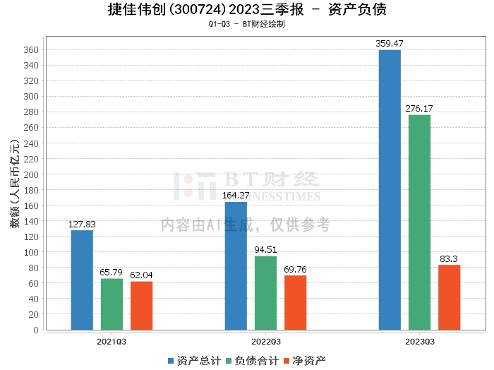 在资产负债方面,捷佳伟创2023年三季报显示,公司资产总计359.47亿元,相比上年度末的191.36亿元,增长了87.85%。负债合计276.17亿元,相比上年度末的119.32亿元,增长了131.68%。净资产83.3亿元,相比上年度末的72.03亿元,增长了15.64%。资产负债率76.83%,相比上年度末的62.36%,有所上升。这些变化主要系报告期销售订单增加,收到的货款增加,销售订单增加导致材料采购的增加,支付合同履约保证金,购买的一年内到期的定期存款增加,新增联营企业,购入以公允价值计量且其变动计入当期损益的长期理财产品,子公司新建厂房,租入的厂房增加,厂房零星维修工程新增,偿还短期借款,材料采购支付的票据增加,销售订单增加导致收到的预收款增加,应交的增值税增加等因素所致。