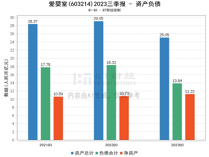 从资产负债方面来看,2023年三季度,爱婴室的总资产为25.05亿元,相比上年度末的27.36亿元减少了8.42%。负债合计为13.84亿元,较上年度末的16.19亿元减少了14.52%。公司的净资产为11.22亿元,较上年度末的11.17亿元略有增加,资产负债率为55.23%,较上年度末的59.18%有所下降。这些数据显示出公司在资产负债管理方面的稳健,负债总额的减少可能与公司提高资金使用率,增加稳健型理财产品的购买有关。