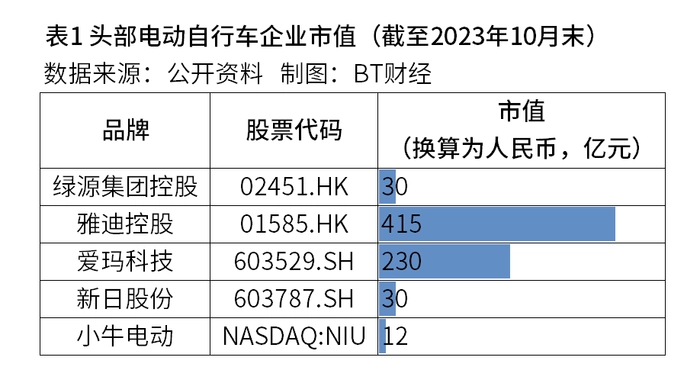 市值方面,BT财经10月底整理发现,上市电动自行车市值最高的是雅迪,约合人民币415亿元;爱玛科技紧随其后,约为230亿元。绿源和新日处于第二梯队,均在30亿元左右,与前两者的差距较大。在美股上市的小牛电动车市值约为12亿元。